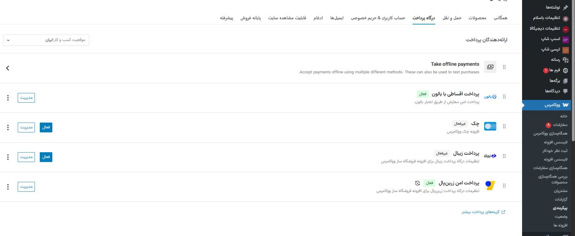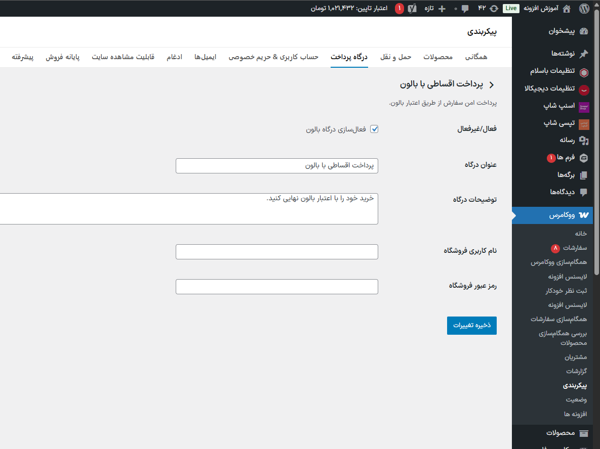 پیکربندی افزونه از طریق یک پنل تنظیمات شفاف و کاربرپسند در بخش درگاههای پرداخت ووکامرس انجام میشود. مدیران میتوانند بهسادگی اطلاعات حساب کاربری بالون خود را وارد کرده، عنوان و توضیحات درگاه را شخصیسازی و آن را فعال یا غیرفعال کنند.
